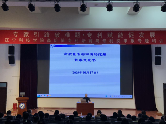 为提升学校科研人员专利挖掘能力与专利奖申报水平,加速高价值专利培育,10月17日,辽宁科技学院在学术报告厅举办“专家引路破难题 专利赋能促发展——高价值专利培育与专利奖申报专题培训”。副校长罗旭东出席会议并讲话。此次培训由科技处主持。